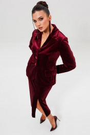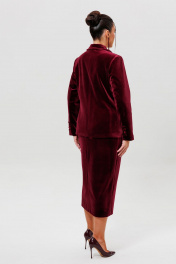 Этот элегантный бордовый костюм с юбкой-карандаш станет основой вашего делового гардероба. Комплект из полуприлегающего жакета и классической юбки выполнен из качественного бархата, что добавляет образу статусности и стиля. Жакет на подкладке с отложным воротником и декоративными пуговицами легко комбинируется с другими вещами, а юбка-карандаш идеально подчеркивает фигуру, оставаясь комфортной для носки в течение всего дня. Данный костюм бордового цвета — прекрасный выбор для работы, деловых встреч, конференций или любого события, где важны безупречный вкус и элегантность.