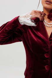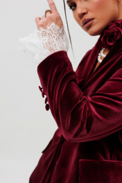 Роскошный бордовый бархатный костюм сотоит из жакета, кружевных манжет и брюк. Модель состоит из полуприлегающего жакета на подкладке и эффектных брюк, которые плавно расклешены к низу, создавая женственный и динамичный силуэт. Жакет с отложным воротником и декоративными пуговицами на рукавах подчеркивает стройность фигуры. Его можно носить отдельно с джинсами или юбками, делая образ универсальным. Брюки с притачным поясом удобно сидят по фигуре. Этот праздничный костюм бордового цвета — идеальный выбор для главной ночи года, который подарит вам уверенность и комфорт. Дополняют модель кружевные манжеты, которые фиксируются по руке на резинку