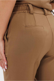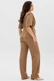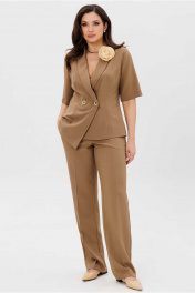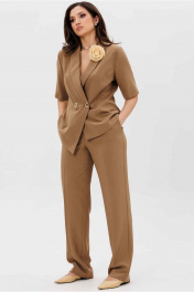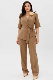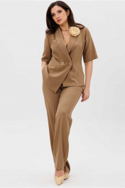 Женский брючный костюм, состоящий из жакета и брюк. Жакет полуприлегающего силуэта, двубортный, с застежкой на две пуговицы. Воротник английский. Рукав втачной, длиной до локтя. По бокам рельефные швы, формирующие силуэт. На уровне груди предусмотрены нагрудные вытачки. Украшает модель съемный декоративный цветок. Брюки прямого силуэта, слегка зауженные к низу. Пояс частично на резинке (по бокам), с шлевками для ремня. Застежка на гульфик с молнией и внутренним крючком. По бокам боковые карманы с косым входом, сзади декоративные прорезные карманы «в рамку». Материал костюма костюмный, средней плотности, с гладкой фактурой. Без подкладки. Дополняет модель широкий пояс.