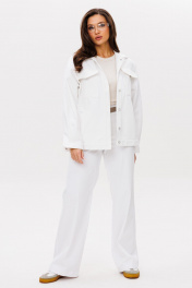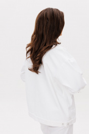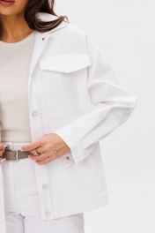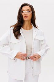 Жакет со спущенными плечами застёгивается на шесть прорезных петель и пуговиц. По переду прорезные карманы с широкой листочкой и накладные карманы с фигурными клапанами на застёжке. Воротник отложной. Рукава одно шовные втачные на манжете. Ткань джинсовая, плотная.
