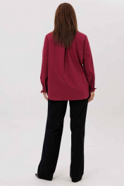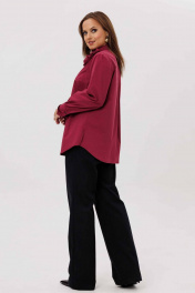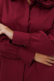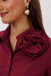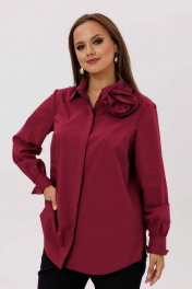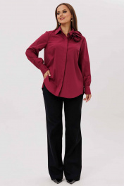 Блуза женская, прямого силуэта с потайной застежкой. Перед с нагрудными вытачками. Спинка с отрезной кокеткой. Воротник рубашечного типа, с отрезной стойкой. Рукав тачной, одношовный, с манжетой по низу. Низ фигурный. Декоративный цветок (съемный, пуговица)