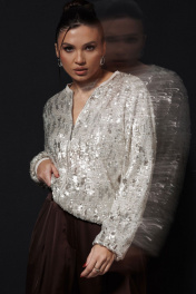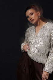 Костюм состоит из жакета и брюк. Жакет(бомбер) полностью покрыт мерцающими пайетками, которые создают неповторимый блестящий эффект при каждом движении. Бомбер с пайетками отлично сочетается с коктейльными платьями, базовыми топами и джинсами, позволяя создавать как дерзкие, так и элегантные луки. Эта пайеточная куртка станет главным акцентом вашего наряда для вечеринки, посещения клуба или романтического свидания. Брюки выполнены из атласной ткани, расширены к низу. На передних половинках брюк обработаны 2 складки и боковые карманы. На задних – талиевые вытачки. Застёжка на молнию и 2 потайных крючка. Эти атласные брюки (Арт. 1282) — Must Have для создания безупречного вечернего или праздничного образа. Модель представлена в двух богатых оттенках: насыщенном красном и глубоком шоколадном. Брюки выполнены из блестящей атласной ткани, которая мягко струится, подчеркивая изящество каждого движения. Атласные брюки с завышенной талией обеспечивают комфортную посадку и визуально вытягивают силуэт. Размеры 46-52.
