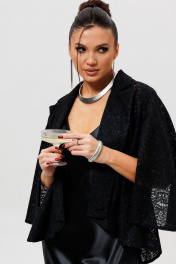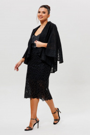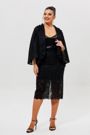 Костюм (жакет и юбка на подкладке) выполнен из кружевной ткани на основе сетки. На ткани пришиты пайетки, которые придают лёгкое мерцание. В кейпе низ изделия и низ рукава фигурные. Силуэт прямой, расширен к низу. Воротник пиджачного типа. Рукав пришит только по окату верхней части, что придаёт эффект отлетного рукава. Всё изделие обработано сеткой в цвет ткани с изнаночной стороны. Юбка на подкладке, прямого силуэта, заужена к низу. На переднем полотнище юбки обработаны талиевые вытачки. На заднем полотнище юбки есть средний шов, который заканчивается разрезом. Обработаны талиевые вытачки. Представляем готовый костюм с кейпом и юбкой, создающий целостный и невероятно эффектный образ для самого особого случая. В комплект входит черный кружевной кейп (Арт. 1278) с мерцающей изнутри отстрочкой-«змейкой» и соответствующая ему кружевная юбка, где та же самая декоративная отстрочка с пайетками выведена на внешнюю сторону, создавая перекликающиеся акценты. Такой костюм с накидкой — идеальное решение для свадьбы в качестве наряда для гостей, торжественного выхода в театр или романтического ужина. Юбка с пайетками и лаконичный кейп вместе создают гармоничный и запоминающийся ансамбль, подчеркивающий ваш утонченный вкус.