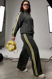 Стильный спортивный костюм в актуальном силуэте — комфортная база для города, путешествий и повседневных образов. Модель выполнена из плотного трикотажного полотна с мягкой, приятной к телу фактурой. Хлопок обеспечивает воздухопроницаемость и комфорт, полиэстер повышает износостойкость и формоустойчивость, а спандекс добавляет эластичность и свободу движений. Куртка прямого силуэта, с центральной застёжкой на тесьму-молнию. Рукав-реглан с притачными манжетами на резинке. Низ изделия обработан притачным поясом на резинке. Функциональные боковые карманы с листочками. Контрастные лампасы по линии рукава. Брюки прямого свободного кроя, с боковыми карманами. Пояс притачной, на широкой резинке с дополнительной регулировкой шнуром. Контрастные лампасы по боковым швам. Низ брюк свободный, без манжет. Костюм представлен в двух цветовых решениях: насыщенный сине-фиолетовый с белыми лампасами и тёмно-серый с бледно-лимонными лампасами. Благодаря продуманной конструкции и качественной обработке швов изделие хорошо держит форму, не деформируется после стирки и подходит для активной носки. Идеальный вариант для тех, кто ценит сочетание функциональности, комфорта и современного спортивного стиля.