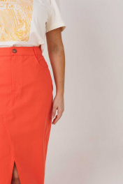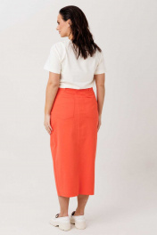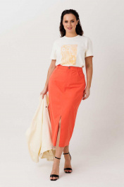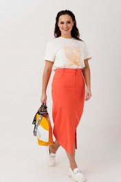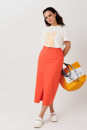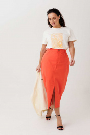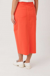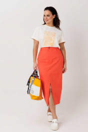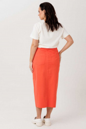 Юбка женская слегка зауженная к низу на притачном поясе со шлёвками, который застёгивается на прорезную петлю и пуговицу. По переду фигурный подрез заканчивается разрезом, застёжка на молнию с гульфиком и откоском и карманы. По спинке центральный шов, кокетка и накладные карманы. Юбка без подкладки. Украшают юбку двойные отделочные строчки.