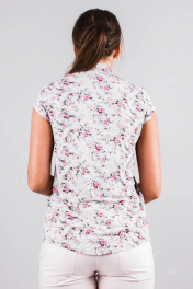 Летняя приталенная блуза из вискозы с коротким рукавом и воротником-стойкой Mita КМ387 белый+роз.цветы