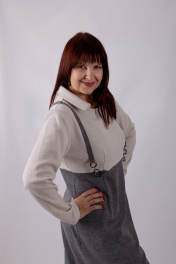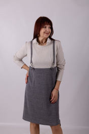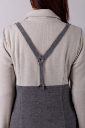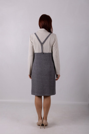 Платье полуприлегающего силуэта. Двухцветное. Круглое горло с отложным воротником. Длинный рукав. Отделка в виде подтяжек. Длина изделия: 98 см Длина рукава: 62 см