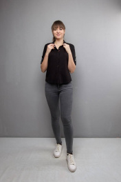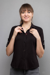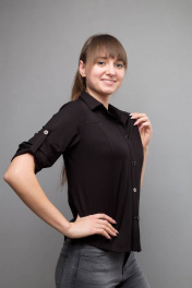 Длина изделия: 57 см Длина рукава: 40 см Блуза черного цвета, прямого силуэта. Застежка планка на пуговицах. Рукав ¾ с патой. Кокетка. Воротник стойка.