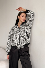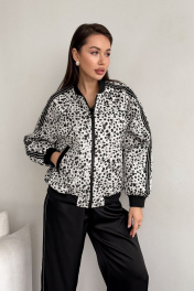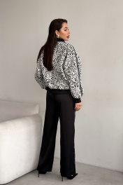 Бомбер из жаккардового полотна. Декорирован лентами. Довязи по горловине, низу изделия и рукавам. Крупная застежка молния. Бомбер на подкладке. Длина бомбера 64 см, длина рукава от воротника 74 см. ОГ 42-44 р-р 126-128 см, 46-48 р-р 134-136 см. Состав вискоза 55%, ПЭ 25%, люрекс 20%