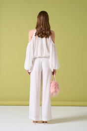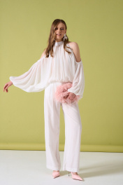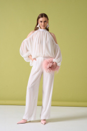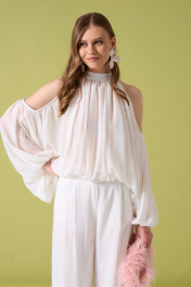 Блуза из летящей ткани с вырезами на плечах. Пояс и низ рукава на резинке. воторник стойка с застежкой на пуговицы по спинке. Длина блузы 50 см 42-44 р-р ОТ 77-79 см 46-48 р-р ОТ 85-87 см Состав 100% ПЭ