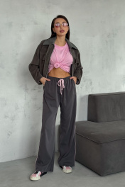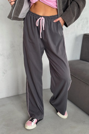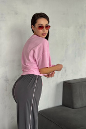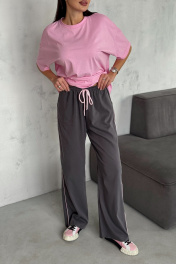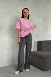 Брюки из вискозного ткани. Пояс на резинке дополнительно кулиса со шнуром. В боковых швах карманы и розовый кант. Длина брюк 111 см. ОТ 42 р-р 64-66 см, 44 р-р 68-70 см, 46 р-р 72-74 см, 48 р-р 76-78 см. Соста 100% вискоза