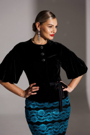Нарядный комплект, состоящий из жакета и юбки. Комфортный жакет из велюра полуприлегающего силуэта с центральной комбинированной застежкой на 3 пуговицы и 3 потайные кнопки. Спинка со средним швом и талиевыми вытачками. По переду также талиевые вытачки. Горловина округлой формы. Объемные фантазийные рукава со складками смягчают строгий силуэт. Декором выступают декоративные пуговицы и завязка на талии. Шикарная юбка из сетки с серебряным напылением заужена к низу. Молния и шлица в среднем шве. По талии кокетки. Костюм на подкладке. длина спинки жакета: 54 см длина юбки: 65 см длина рукава от горловины: 55 см