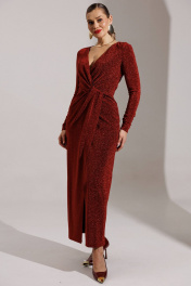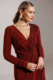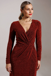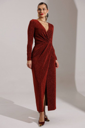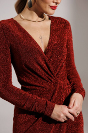 Блеск софитов, огни салютов, игривые пузырьки в бокале - и Ваше сияние обеспечено нашим вечерним платьем! Это действительно озорно, игриво, празднично! И, как ни крути, приковывает взгляды! Представленное платье приталенного силуэта. Спинка с талиевыми вытачками. Перед отрезной по линии талии. Лиф с эффектным V-образным вырезом и узлом в области талии. Юбка на запах. Рукав полуреглан, присборенный на резинку в нижней части (по шву). Платье на подкладке. Материал платья - тонкий трикотаж с блеском. Хорошо тянется. длина рукава (полуреглан): 68 см длина спинки: 143 см