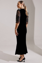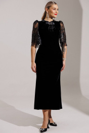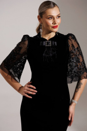 Новинка от бренда Мода-Юрс - велюровое платье в тандеме с гипюром. Черный цвет в одежде - символ утонченности и роскоши. Платье подчеркивает женственные линии фигуры и не оставит шанса не влюбиться! Платье полуприлегающего силуэта с рельефами по переду и талиевыми вытачками по спинке. Рукав втачной, по окату со сборкой, к низу расширен. По переду платье со стойкой, которая застегивается на навесную петлю и пуговицу и на крючок внутри. длина рукава: 43 см длина спинки: 135 см