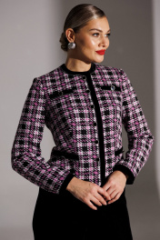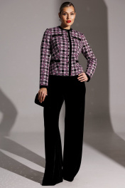 Брючный костюм в стиле Шанель представляет собой элегантное сочетание классики и современности. Жакет выполнен из трикотажного полотна с актуальным принтом «гусиная лапка», имеет полуприлегающий силуэт и центральную застежку на пуговицы. Спинка оформлена средним швом и талиевыми вытачками, что обеспечивает идеальную посадку. Передняя часть также украшена талиевыми вытачками, а округлая горловина подчеркивает женственность образа. Функциональные карманы с листочками расположены внизу, в то время как имитация карманов в верхней части переда добавляет изюминку. Листочки на карманах и планка горловины выполнены из бархата с отделкой по краям, создавая контраст текстур. Рукава втачные, двухшовные, с планкой по низу, также отделанной бархатом. Жакет на подкладке, что обеспечивает комфорт при носке. Брюки палаццо из бархата имеют стильные широкие штанины и удобную резинку на поясе, что делает этот костюм идеальным выбором как для деловых встреч, так и для вечерних выходов. длина жакета по спинке: 56 см длина брюк по боковому шву: 112 см