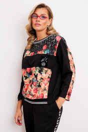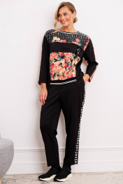 Ультрамодный гламурный спортивный костюм. Состоит из джемпера и брюк. Выполнен из трикотажного однотонного полотна и трикотажа с трендовым принтом. Джемпер прямого силуэта с цельнокроенными рукавами. Спинка цветная цельнокройная Перед скомбинирован с однотонными вставками. По низу переда и горловине декоративные резинки-довязы. Брюки зауженные к низу с лампасами и манжетами. Пояс на резинке с декоративными завязками-шнурами. Карманы боковые. длина брюк: 102 см длина джемпера по спинке: 63 см длина рукава: 55 см