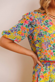 Комплект женский, состоящий из блузы, которая выполнена из шифона, и однотонных брюк. Блуза полуприлегающего силуэта, с баской, по линии талии на резинке. Рукав втачной, снизу на резинке, сверху по окату с воланами. Брюки прямые, сверху на притачном поясе, сзади с резинкой, по переду с карманами. длина спинки блузы: 68 см длина брюк: 108 см длина рукава: 36 см