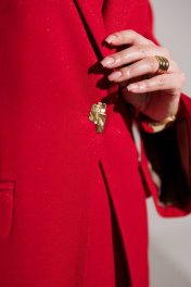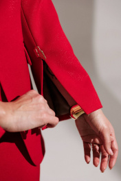 Нарядный комплект, состоящий из жакета и платья. Жакет - воплощение стильной трансформации. Его классический крой выполнен из безупречной трикотажной ткани, но в деталях скрывается своенравный характер. Жакет полуприлегающего силуэта. Модель отличается аккуратным кроем и стильными деталями. На передней части жакета обработаны вертикальные рельефы, идущие от проймы до уровня кармана и от кармана до низа, что придаёт силуэту выразительность и стройность. Воротник пиджачного типа добавляет классической элегантности. Застёжка центральная бортовая на петлю-пуговицу. Карманы в рамке с клапанами, гармонично расположены на передней части жакета. Спинка с центральным швом и вертикальными рельефами, идущими от проймы. Рукава двухшовные с отрезной деталью по окату и разрезами внизу добавляют свободы движению и делают модель более интересной. Жакет на подкладке. Платье женское приталенное из трикотажного полотна, длиной ниже колена. Рукава короткие - «крылышки». Вырез горловины спереди «лодочкой», сзади - V-образный. Платье приталено вытачками. В среднем шве спинки обработана шлица и потайная молния. Платье на подкладке. длина спинки жакета: 74 см длина рукава: 61,5 см длина платья по боковому шву: 101 см
