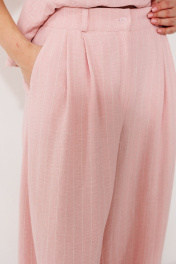 В этом костюме чувствуется дыхание жарких стран и лёгкость творческого беспорядка. Натуральная ткань под лён, мягкая и фактурная, в неброскую полоску словно выбелена солнцем, а силуэт балансирует между расслабленным востоком и утончённой женственностью. Блуза полуприлегающего кроя, с талёвыми вытачками, нежно обнимает фигуру, а слегка спущенное плечо и глубокий V-образный вырез дарят прохладу и открывают изящную линию шеи. По горловине струится стояче-отложной воротник, который, не замыкаясь, переходит в длинные фигурные завязки — их можно небрежно завязать бантом или остить свисающими, как шарф. Ниже талии блузу опоясывает двойная отрезная баска - она ложится мягкими волнами, скрывая линию соединения с юбкой или брюками, а разрез спереди добавляет интриги и свободы при движении. Молния аккуратно спрятана в левом боковом шве, а средний шов на спинке делает посадку безупречной. Брюки-алладины парят в воздухе. С высокой посадкой и мягкими складками от пояса по переду, они создают благородный напуск, словно шальвары. Пояс плотно сидит на талии благодаря притачному поясу со шлёвками и частичной резинке сзади — в движении брюки не сползают, но дышат вместе с вами. Спереди — объёмные карманы с отрезным бочком, куда так удобно спрятать руки или ракушку с пляжа. Главная деталь - низ, стянутый широкими манжетами с резинкой внутри; они собирают штанину в мягкое «облачко», открывая щиколотку, а вытачки на задних половинках изящно облегают фигуру, не добавляя лишнего объёма.
