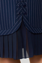 Платье женское прямого силуэта, без подкладки, тесьма-молния в среднем шве спинки. Перед с нагрудными вытачками, по низу пришита вставка, под ней отделочная деталь с складками. Спинка со средним швом, талиевые вытачки, по низу пришита вставка, под ней отделочная деталь, закругленная к центру, с складками. Рукав одношовный втачной. Горловина обработана обтачкой. В качестве отделки пришиты пуговицы по центру вставки спинки.