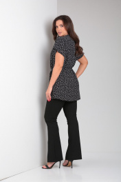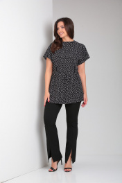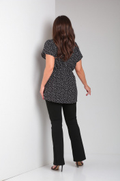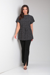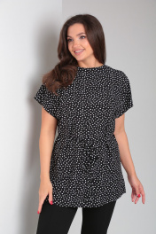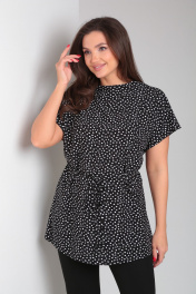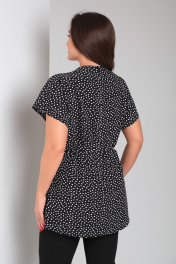 Туника женская свободного кроя со спущенной линией плеча и цельнокроеным воротником стойкой. Рукав короткий. Спинка блузки разрезная, сверху на потайной молнии. В боковых швах шлевки для пояса. Туника идет с тонким поясом из основной ткани.