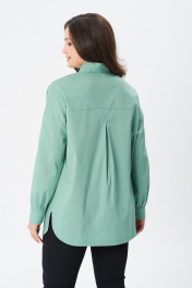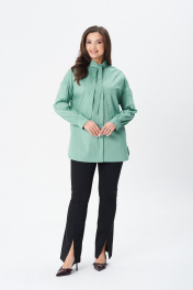 Стильная женская рубашка свободного кроя с воротником стойкой завязывающейся в бант и спущенной линией плеча. По переду планка на потайную застежку петли пуговицы. Рукав в тачной двух шовный с планкой на всю длину рукава и манжетой, застегивающейся на петли-пуговицы. Спинка изделия с кокеткой и заложенной складкой. Низ рубашки фигурный.