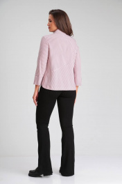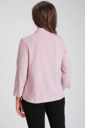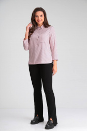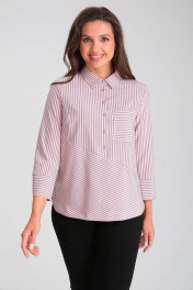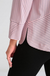 Блузка женская c рубашечным воротником, свободного силуэта. Полочка и спинка изделия, горизонтально разрезные на косую. Верхняя часть полочки с нагрудными вытачками, накладным карманом на левой части и цельнокроеной планкой на застежку. Рукав прямой, втачной с широкой манжетой на отворот. Низ изделия фигурный с разрезами по боковым швам, обработан широкой обтачкой.