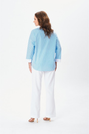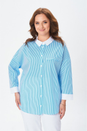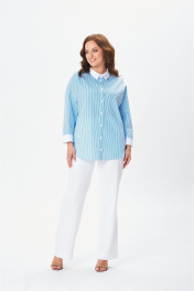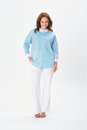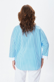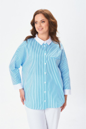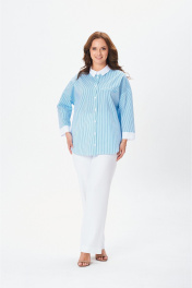 Стильная рубашка свободного кроя с центральной планкой на застежку петли-пуговицы по полочке. Плечо изделия спущено. Рукав 7/8 прямой с широкой манжетой. Воротник со стойкой. Спинка изделия цельная. Низ изделия фигурный отстрочен отделочной строчкой.