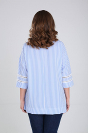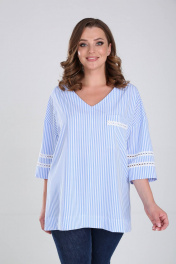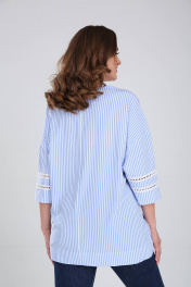 Стильная блузка свободного покроя с V-образным вырезом горловины. Линия плеча спущенная, рукав длинной за локоть. Блузка с накладным карманом слева. Рукава и карман декорированы кружевной лентой. По низу изделия широкая подгибка.