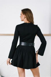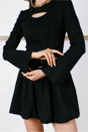 Платье-мини прилегающего силуэта отрезное чуть ниже линии талии, с декоративной прорезью на груди. Выполнено из непрозрачного плательного вискозосодержащего, формоустойчивого трикотажного полотна. Юбка на трикотажной подкладке. Перед лифа с рельефами и кокеткой. Спинка лифа со средним швом и рельефами. Низ лифа оформлен фигурной линией. Кокетка скреплена с передом таким образом, что по левой стороне она спрятана под основной деталью. Юбка-баллон со сборкой по верхнему и нижнему срезу. Рукав расклешенный втачной длинный одношовный с разрезом. Вырез горловины округлый. Застежка на потайную молнию в среднем шве спинки.