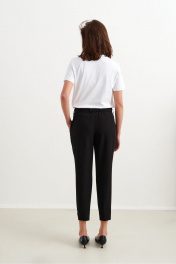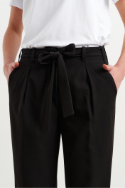 Брюки-бананы из смесового текстиля Сзади по линии талии идет резинка Передние половинки с заложенной складкой По бокам наклонные карманы В комплекте пояс из ткани основы
