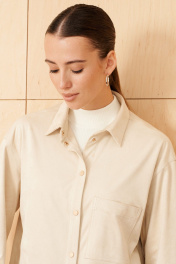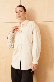 Блузка из эко замши на трикотажной основе, прямого свободного силуэта, длинной ниже линии бедер.Воротник рубашечный. По переду застежка на кнопки, нагрудный накладной карман и горизонтальный подрез ниже линии талии. Рукав двухшовный рубашечный полной длины, внизу на манжете. По спинке кокетка и 2 складки.