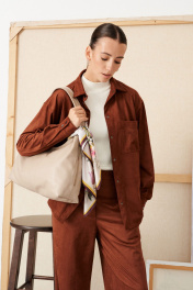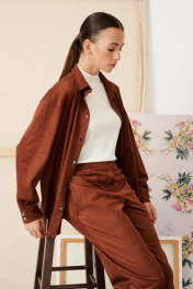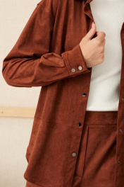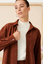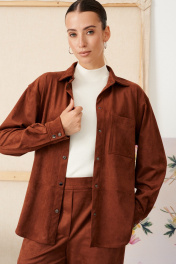 Блузка из эко замши на трикотажной основе, прямого свободного силуэта, длинной ниже линии бедер.Воротник рубашечный. По переду застежка на кнопки, нагрудный накладной карман и горизонтальный подрез ниже линии талии. Рукав двухшовный рубашечный полной длины, внизу на манжете. По спинке кокетка и 2 складки.