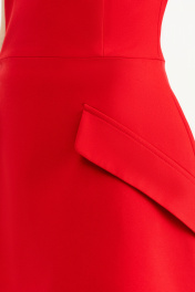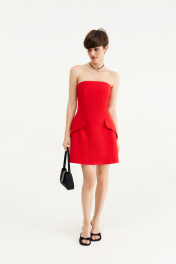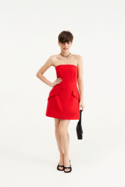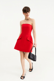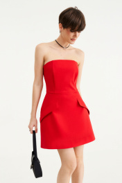 Платье - Длина мини Красного цвета, Открытые плечи, Верх платья выполнен из корсета, Объемная юбка с клапанами, Застегивается на молнию по центру на спине.
