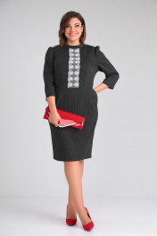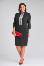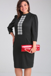 Элегантное женское платье полуприлегающего силуэта, выполненное из костюмно-плательной ткани в тонкую полоску (тянется). Перед отрезной по линии талии. По лифу переда талиевые вытачки и настрочное отделочное кружево. По нижней части переда заложены складки, на уровне бедер – наклонные карманы с отрезными бочками. Горловина оформлена стойкой. Спинка с центральным швом и талиевыми вытачками. Застежка на тесьму-молнию в среднем шве спинки. Рукава втачные, одношовные, присборенные по окату. Длина платья по среднему шву спинки во всех р-ах – 95 Длина рукава во всех р-ах – 48 Ширина рукава на уровне глубины проймы ½ - р46-18,5, р48-19, р50-19,5 ОГ ½ - р46-51, р48-53, р50-55 ОТ ½ - р46-44, р48-46, р50-48 ОБ ½ - р46-52, р48-54, р50-56