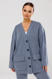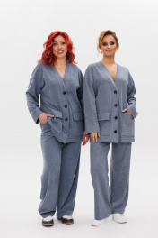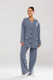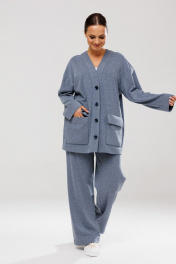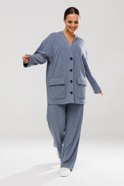 Стильный женский костюм, состоящий из джемпера и брюк. Выполнен из трикотажного полотна (тянется). Кардиган свободного кроя с центральной застежкой - планкой на пришивные пуговицы. Рукав слегка спущен. По переду накладные карманы с клапаном. Брюки свободного прямого кроя, в боковых швах карманы. Верхний срез брюк обработан поясом с резинкой.