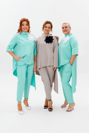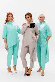 Стильный женский костюм, состоящий из блузона и брюк, выполненных из трикотажного полотна с легким ненавязчивым блеском (тянется). Изюминка данной модели – съемный декор-цветок. Блузон А-образного силуэта с ассиметричным низом. Перед цельный. Спинка со средним швом. Горловина оформлена цельновыкроенной стойкой. Рукав втачной, одношовный. Длина блузона по среднему шву спинки – р48,50,52 – 94, р54,56,58 – 95 Длина рукава во всех р-ах – 40 Ширина рукава на уровне глубины проймы ½ - р48-19, р50-20, р52-20,5, р54-21,5, р56-22, р58-22,5 Ширина рукава внизу ½ - р48-12,5, р50-13, р52-13,5, р54-14, р56-14,5, р58-15 ОГ ½ - р48-56, р50-58, р52-60, р54-62, р56-64, р58-66 ОТ ½ - р48-60, р50-62, р52-64, р54-66, р56-68, р58-70 ОБ ½ - р48-66, р50-68, р52-70, р54-72, р56-74, р58-76 Брюки заужены к низу, длиной 7/8, с высокой посадкой. По переду имитация гульфика. В боковых швах наклонные карманы. Верхний срез брюк обработан поясом с резинкой. Длина брюк по боковому шву – р48,50,52 – 97, р54,56,58 – 98,5 Длина брюк по внутреннему шву во всех р-ах – 69 Ширина брюк внизу ½ - р48-17,5, р50-18, р52-18,5, р54-19,5, р56-20, р58-20,5 Высота посадки спереди – р48,50,52 – 31, р54,56,58 – 33 Высота посадки сзади – р48,50,52 – 43,5, р54,56,58 – 45,5 ОТ с раст резинкой (max) ½ - р48-53, р50-55, р52-57, р54-59, р56-61, р58-63 ОБ ½ - р48-53, р50-55, р52-57, р54-59, р56-61, р58-63