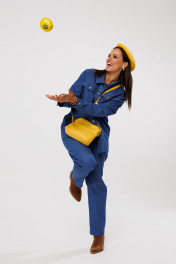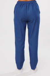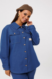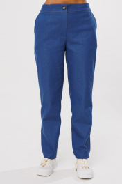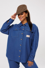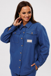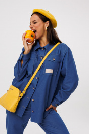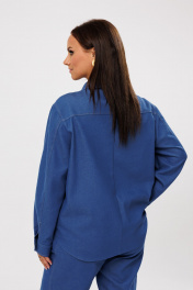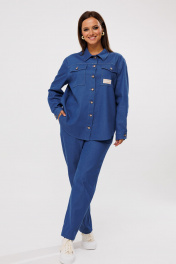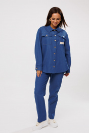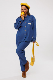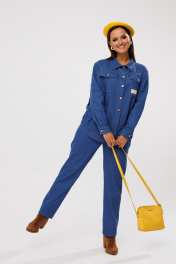 Стильный женский костюм состоит из рубашки и брюк, выполнен из джинсовой ткани (тянется). Рубашка прямого силуэта со спущенной линией плеча. По переду отрезные кокетки, в шов которых вставлен клапан, накладные карманы. По левому карману – пришивной лэйбл. Застежка центральная на петли-пуговицы. Спинка с отрезной кокеткой, на болты. Воротник отложной рубашечного типа. Низ округлой формы. Брюки прямого силуэта с высокой посадкой, в боковых швах наклонные карманы, по срезу банта – застежка-молния. Верхний срез оформлен поясом с эластичной резинкой по задней половинке.