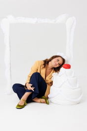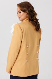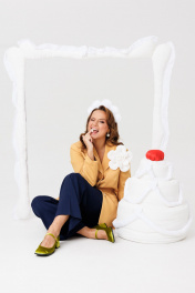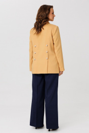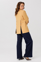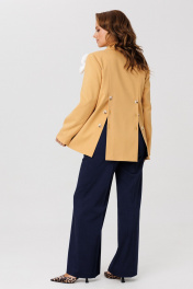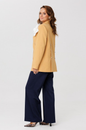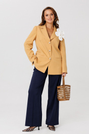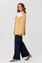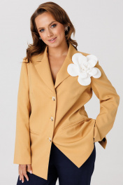 Стильный женский костюм, состоящий из жакета и брюк, изготовлен из костюмной ткани (чуть тянется). Жакет прямого силуэта. По переду нагрудные вытачки. Воротник с отложными бортами пиджачного типа. Застежка на три петли-пуговицы. На полочке функциональные карманы. Спинка с рельефами, переходящими в шлицу. На шлице застежка на три петли-пуговицы. Рукав втачной, двухшовный. Жакет на подкладке. Декоративным элементом является съемный цветок. Брюки свободного кроя с высокой посадкой. В боковых швах функциональные карманы. Верхний срез брюк оформлен поясом с резинкой в боковых швах. Застежка в брюках на тесьму-молнию.