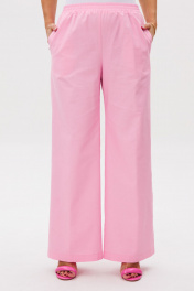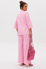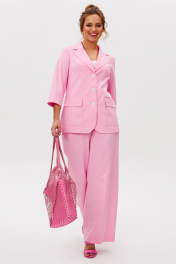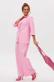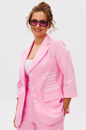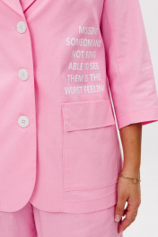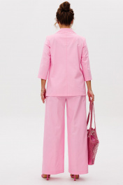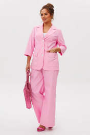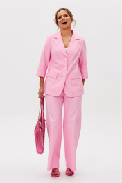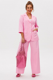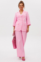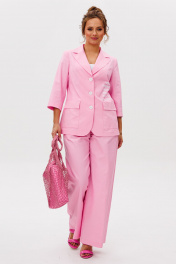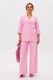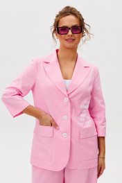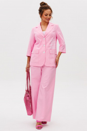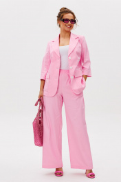 Стильный женский костюм, состоящий из жакета и брюк, выполнен из натуральной льняной ткани (не тянется). Жакет прямого силуэта без подкладки. По переду вытачки от плечевого шва, накладные карманы с цельнокроенными клапанами. На левой части переда печать. Застежка центральная на петли-пуговицы. Спинка со средним швом. Горловина оформлена воротником пиджачного типа с лацканом. Рукава втачные двухшовные, длиной ¾. Брюки свободного, прямого кроя с высокой посадкой. В боковых швах функциональные карманы. Верхний срез оформлен поясом с эластичной резинкой.