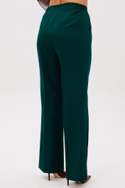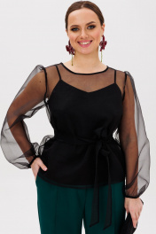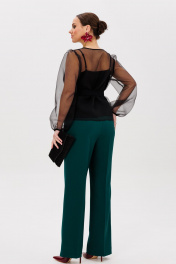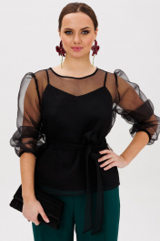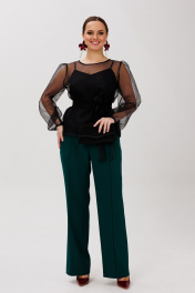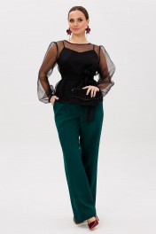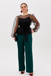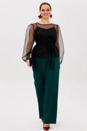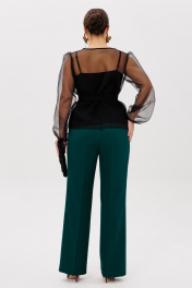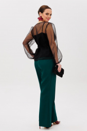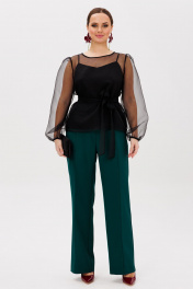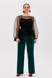 Нарядный женский комплект, состоящий из блузы, топа и брюк. Блуза прямого, свободного силуэта, выполнена из органзы (не тянется). Перед и спинка цельные. Горловина округлой формы, обработана окантовкой. Рукава втачные, одношовные со сборкой по окату и резинкой по низу. В комплект входит пояс из основной ткани – органзы. Топ полуприлегающего силуэта из блузочного крепа (тянется). Длина топа регулируется бретелями. Горловина переда V-образной формы, обработана обтачкой. По переду нагрудные вытачки. Брюки прямого кроя с высокой посадкой, выполнены из костюмной ткани (немного тянется) с наклонными карманами в боковых швах. По передним половинкам вертикальная застроченная складка на 0,5 см. По срезу банта – застежка-молния. Верхний срез оформлен поясом с эластичной резинкой по задней половинке.