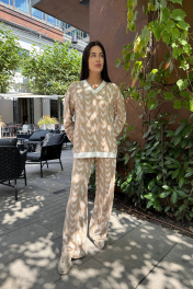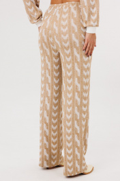 Стильный женский костюм, состоящий из джемпера и брюк. Джемпер прямого силуэта со спущенной линией плеча, выполненный из эластичного трикотажного полотна (тянется). Перед и спинка цельные. Горловина V-образной формы, оформлена довязом белого цвета, который освежает. Рукав одношовный. По низу рукава и низу джемпера – притачные манжеты из довяза. Брюки свободного прямого кроя с высокой посадкой, с карманами в боковых швах. Верхний срез брюк оформлен поясом с эластичной резинкой.