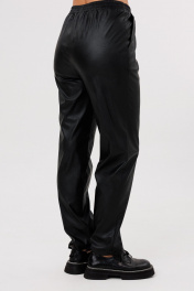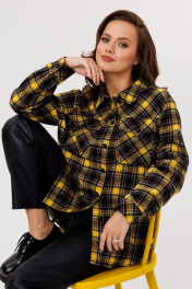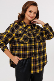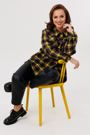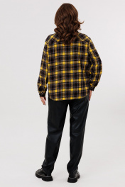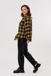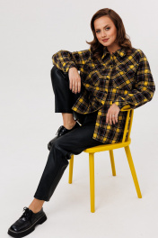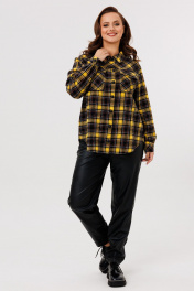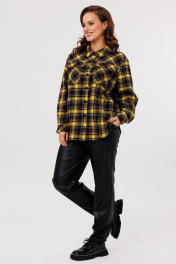 Стильный женский комплект, состоящий из рубашки и брюк. Рубашка прямого силуэта со спущенной линией плеча, выполненная из костюмной ткани в клетку (не тянется). По переду отрезные кокетки, в шов которых вставлен клапан, накладные карманы. Застежка центральная на петли-пуговицы. Спинка с отрезной кокеткой. Рукава втачные, двухшовные, по низу с притачной манжетой, застегивающейся на пуговицы. Воротник отложной рубашечного типа. Низ округлой формы. Брюки зауженные к низу с высокой посадкой, выполненные из экокожи на текстильной основе (чуть тянется). В боковых швах наклонные карманы. Верхний срез оформлен поясом на эластичной резинке.