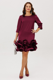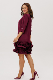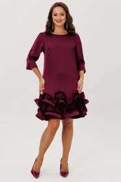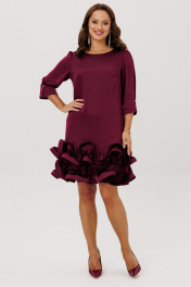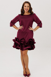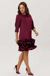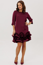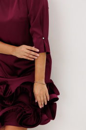 Нарядное платье полуприлегающего силуэта, выполненное из струящегося шелка «Армани» (немного тянется), без подкладки. По переду нагрудные вытачки. По спинке средний шов с застежкой на навесную петлю-пуговицу. Горловина округлой формы. Рукава втачные одношовные со сборкой по окату, встречной складкой и отделочной пуговицей по низу. Низ платья оформлен двумя присборенными воланами, края которых обработаны специальной тесьмой для придания формы изгибов воланам ( тесьма мягкая, подвижная).