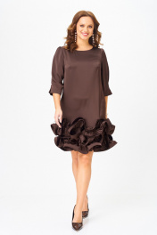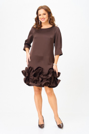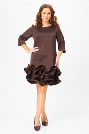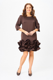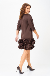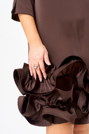 Нарядное платье полуприлегающего силуэта, выполненное из струящегося шелка «Армани» (немного тянется), без подкладки. По переду нагрудные вытачки. По спинке средний шов с застежкой на навесную петлю-пуговицу. Горловина округлой формы. Рукава втачные одношовные со сборкой по окату, встречной складкой и отделочной пуговицей по низу. Низ платья оформлен двумя присборенными воланами, края которых обработаны специальной тесьмой для придания формы изгибов воланам ( тесьма мягкая, подвижная).