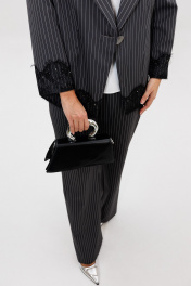 Нарядный женский комплект, состоящий из жакета, брюк и блузы. Жакет прямого силуэта со спущенной линией плеча, выполнен из костюмной ткани в тонкую полоску (чуть тянется). По переду нагрудная вытачка, центральная застежка на одну петлю и пуговицу. Горловина оформлена воротником пиджачного типа с лацканом. Спинка со средним швом. Рукава одношовные, длиной 7/8. Жакет без подкладки. Жакет декорирован по низу и по низу рукавов французским кружевом со стразами. Блуза полуприлегающего силуэта со спущенной линией плеча, выполненная из блузочной ткани (тянется). Горловина округлой формы. В боковых швах небольшие разрезы. Брюки прямого кроя с высокой посадкой, выполненные из костюмной ткани в тонкую полоску (чуть тянется) с наклонными карманами в боковых швах. По срезу банта застежка-молния. Верхний срез оформлен поясом с эластичной резинкой по задней половинке.