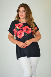 Блузка женская из смешанной принтованной ткани. Блузка расширенного силуэта, повседневная и нарядная одновременно, со спущенным рукавом. Перед и спинка цельная. Низ изделия фигурный, перед короче спинки, с разрезами по боковым швам. Низ рукавов с притачной манжетой по низу, которая подвернута и закреплена. Овальный вырез горловины окантован. Длина по спинке: р. 52/54/56-71 см, р.58/60/62-75 см. Длина рукава от горловины: р. 52/54/56-26 см. р. 58/60/62-29 см.
