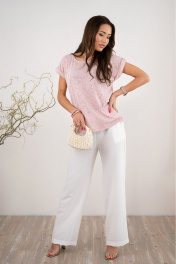 Обратите внимание на таблицу замеров! Блузка летняя из вискозасодержащего трикотажа, свободного силуэта, оверсайз. Особенностью данной модели является настоящий польский фабричный мягкий высококачественный трикотаж. Блузка украшена геометрическим узором, тонкая, горловина округлая, по бедрам резинка, рукава реглан короткие, с манжетами, на левом рукаве декоративная вставка. Стильный цвет добавит современности вашему базовому гардеробу.