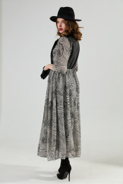 Платье комбинированное длиной макси, отрезное по линии талии с цельнокроеными рукавами. Застежка центральная с цельнокроеными планками на петли и пуговицы. Верхние части переда и спинки с вертикальными рельефами, начинающимися от линии плеча. Бантовая складка расположена по центру, боковые складки направлены от центра изделия в сторону бокового шва. Рукав цельнокроеный с боковыми частями переда и спинки с углубленной до линии талии проймой. По центру оката рукава сборка. Нижний срез рукава обработан притачной манжетой. Застежка манжеты на петли и пуговицы. Платье по линии талии собрано на резинку. Горловина изделия круглой формы, обработана воротником-стойкой, с застежкой на петли и пуговицы. Платье дополнено съёмным бантом. Бант съёмный, продевается в шлевки, расположенные на воротнике-стойке.