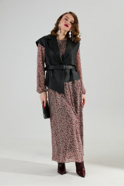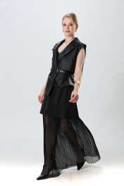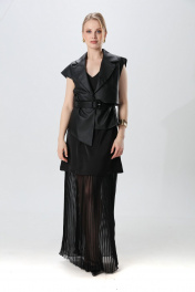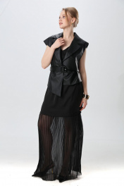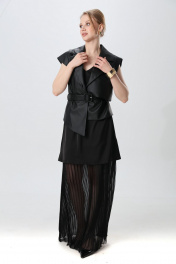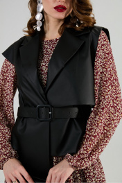 Жилет из экокожи прямого силуэта с воротником пиджачного типа. По правой пройме переда расположена фигурная деталь "крылышко". Спинка со средним швом. По низу правого переда и низу правой спинки фигурная деталь. По левой части переда и левой части спинки отлетная кокетка. Изделие идёт в комплекте с ремнем из экокожи.